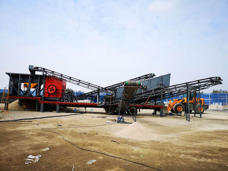破碎制砂生產線由其他工程機械給料,(如:裝載機、挖機等)它能一次性完成原礦的儲料、均勻給料、粗碎、細碎、篩分和成品料的輸送,設備整體為被牽引輪式移動,主要構成有:牽引式底盤、載重后橋、液壓支撐穩定結構、機械固定樁、支撐式輸送機、儲料槽、給料機、折疊式上料機、顎式破碎機、液壓舉升振動篩、重錘破碎機、動力系統和電器控制系統組成。